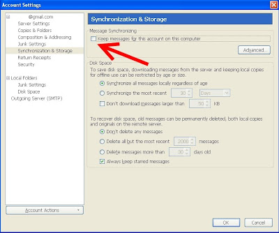 - For each IMAP account that is configured in your Thunderbird, choose Synchronization & Storage and under Message Synchronization uncheck the Keep Messages For This Account On This Computer checkbox.