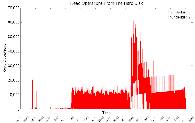 While Thunderbird 2 performs minor read operations from the hard disk, Thunderbird 3 performs thousands of read operations during long periods of time.