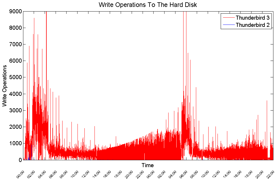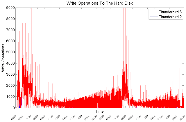 While Thunderbird 2 performs minor write operations to the hard disk, Thunderbird 3 performs thousands of write operations during long periods of time.