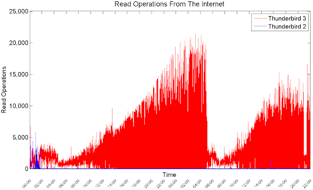 While Thunderbird 2 performs minor download operations from the Internet, Thunderbird 3 performs thousands of download operations during long periods of time.